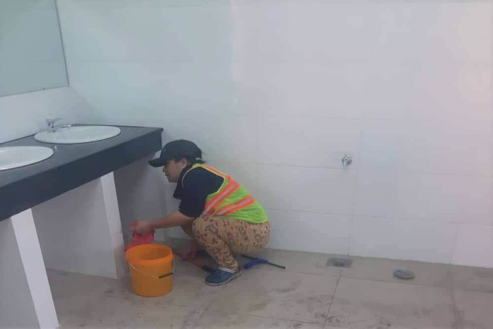 - Khu vực thi công: Loại bỏ bụi bẩn, mảnh vụn vật liệu xây dựng, xi măng, sơn, và các vết bẩn khác bằng máy phun áp lực cao và dụng cụ chuyên dụng.