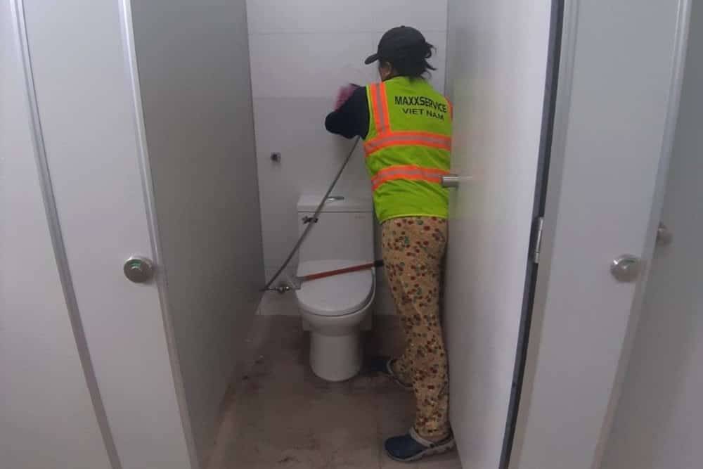 - Toilet: Lau gương, lau bàn đá, làm sạch bồn rửa mặt, bồn cầu, bồn tiểu, tường, quạt hút, quạt thông gió, chà rửa sàn bằng máy chà sàn, khử mùi toilet, lau cửa toilet.